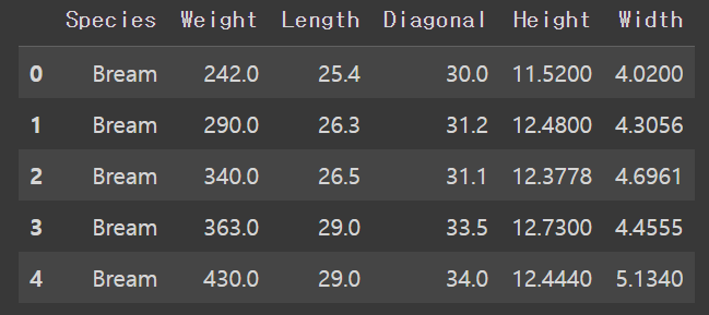 ['Bream' 'Smelt' 'Bream' 'Bream' 'Bream']