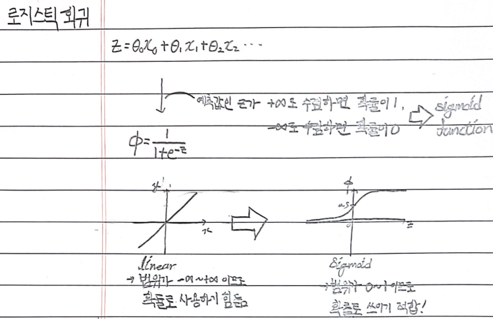 -> 로지스틱 함수를 이용한 값은 연속적이며, 0~1의 범위를 가지기 때문에 확률로 사용하기에 적합해보인다!