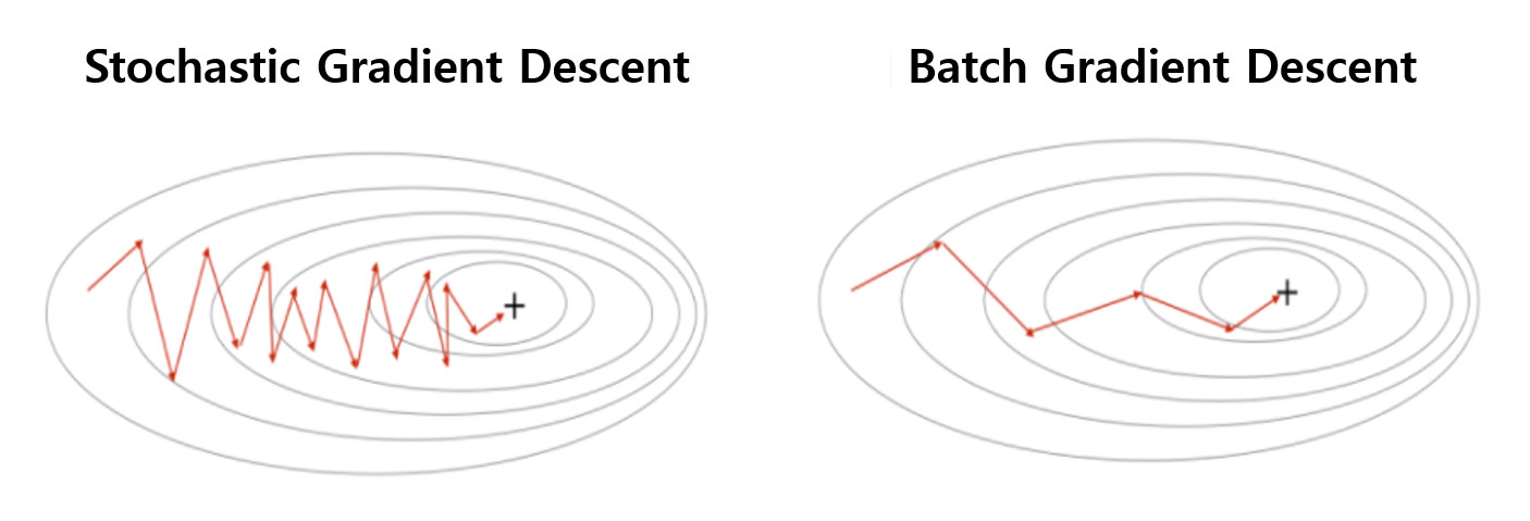 - 배치 경사 하강법: batch size를 데이터셋 전체로 잡아 진행하는 경사하강법