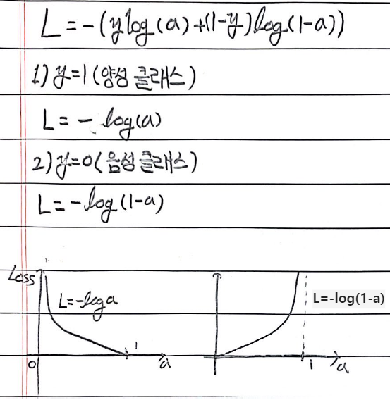 y를 타깃, a를 로지스틱 함수의 결과값이라고 했을 때, 손실 함수는 다음과 같이 y가 1일 때, y가 0일 때로 구분할 수 있다.