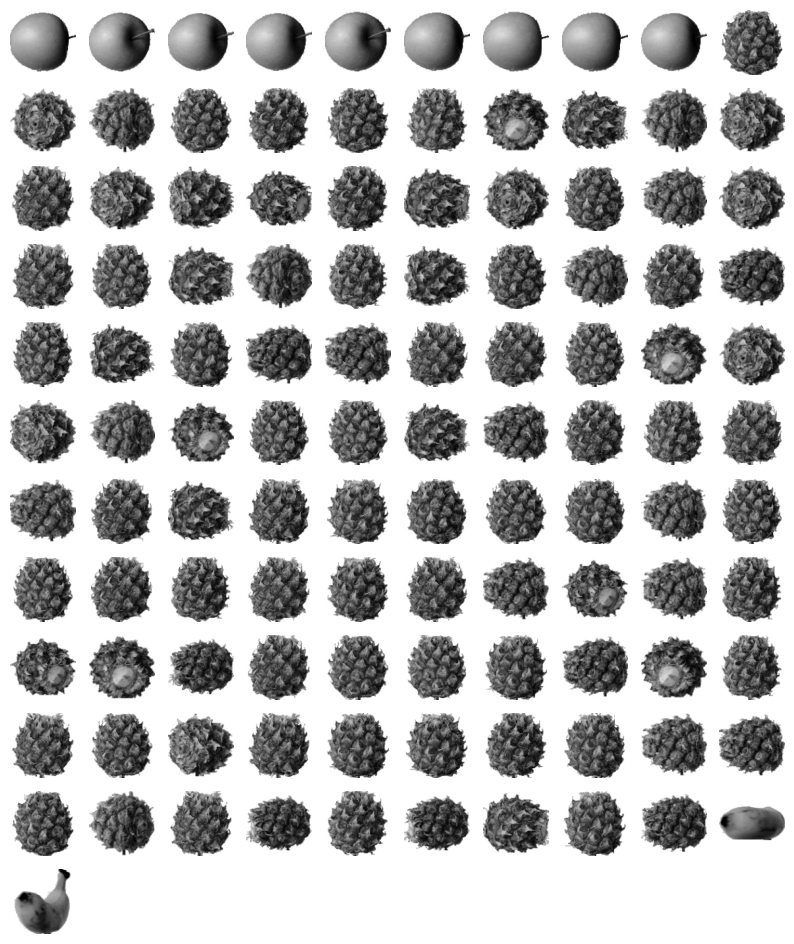- 처음 100개의 데이터는 사과, 다음 100개는 파인애플, 다음 100개는 바나나라는 것을 알 수 있다.