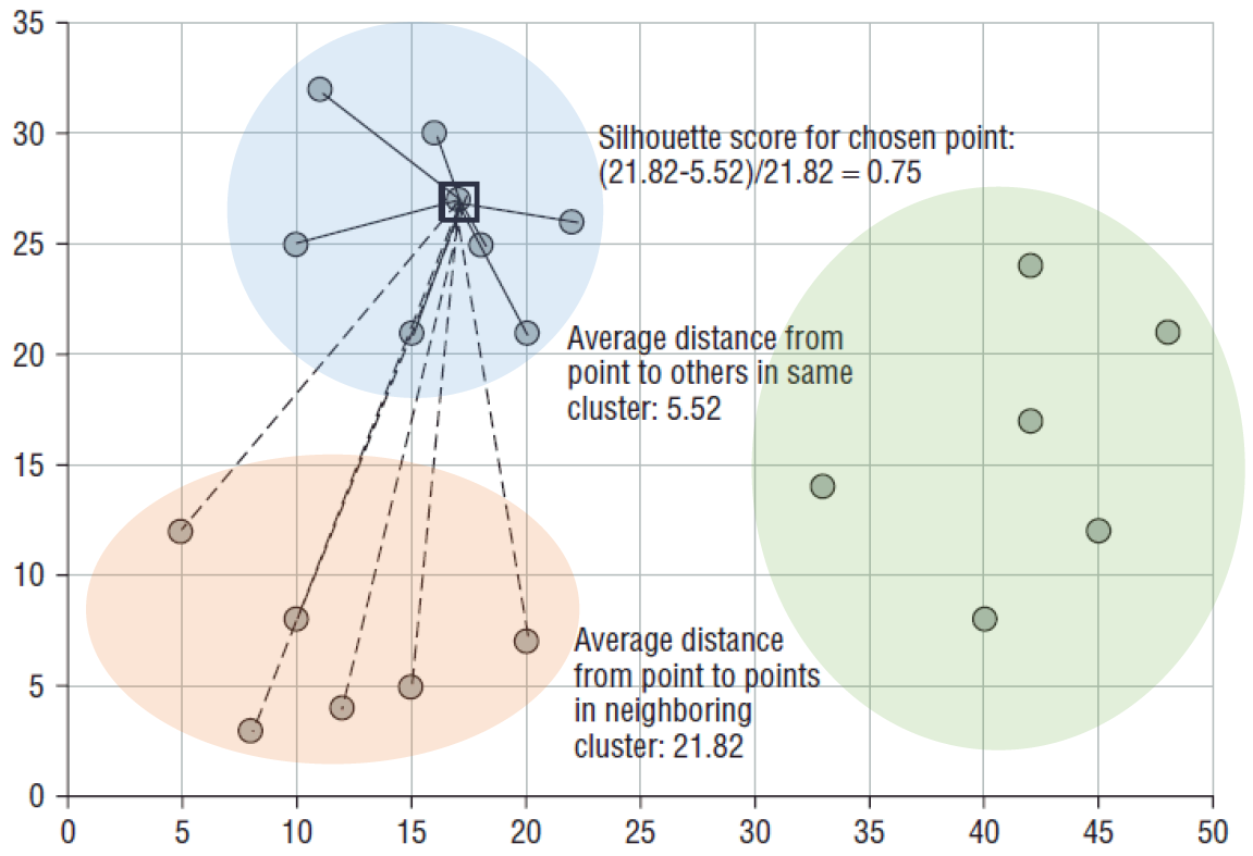 - $b(i)$: $i$번째 개체가 속한 군집과 가장 가까운 이웃 군집에 속하는 요소들과의 거리 평균
