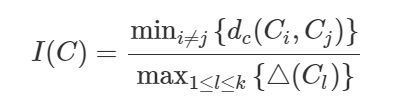 - Dunn Index: 군집 간 거리의 최소값을 분자, 군집 내 요소 간 거리의 최소값을 분모로 하는 지표이다.