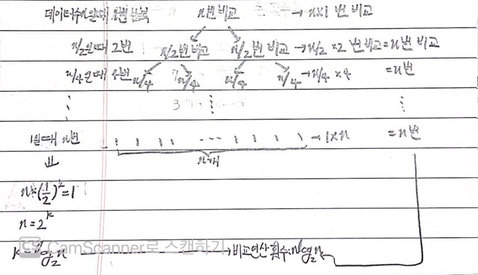 - 위에서 언급한 중간값을 선택하는 방법을 적용하면 퀵 정렬의 빅-오는 다음과 같이 $O(nlog_2n)$