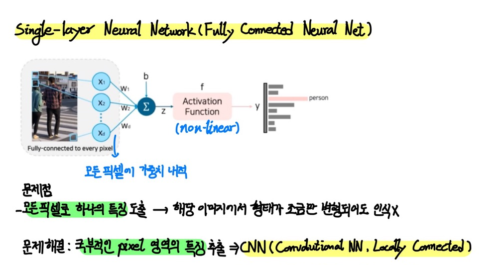 - input 이미지의 모든 픽셀에 서로 다른 가중치 내적을 적용한 후 bias를 더한 sum을 non-linear Activation Function에 통과시키는 방법이다.