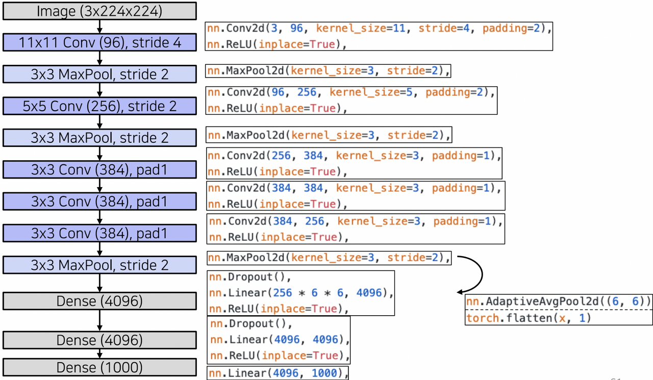 - 5개의 Convolution Layer, Fully Connected Layer 3개로 이루어짐