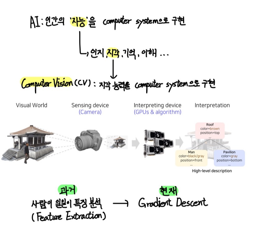 - 컴퓨터 비전(computer vision): 시각 지각 능력(Visual perception & intelligence)을 컴퓨터 시스템으로 구현하는 것을 의미한다.