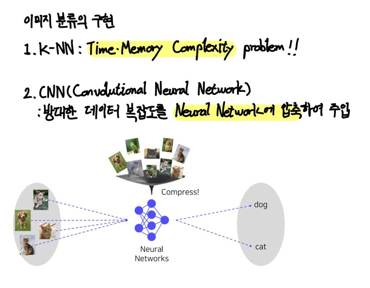 - 분류기가 세상의 모든 이미지 데이터를 저장하고 있다 가정하면, K-NN 알고리즘으로 간단하게 이미지 분류 문제를 해결할 수 있지만, 시간복잡도, 메모리복잡도의 문제가 발생한다.