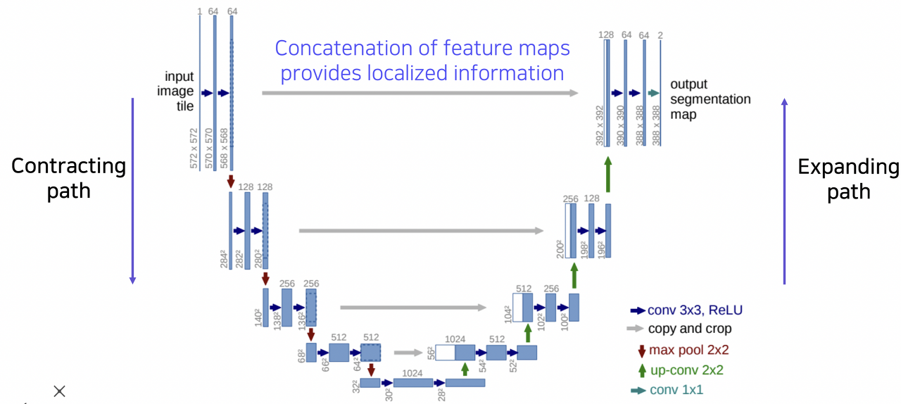 - upsampling 과정에서는 image 해상도는 두 배로 늘리고, 채널 수는 절반으로 줄이는 방식으로 segmentation map을 얻는다.