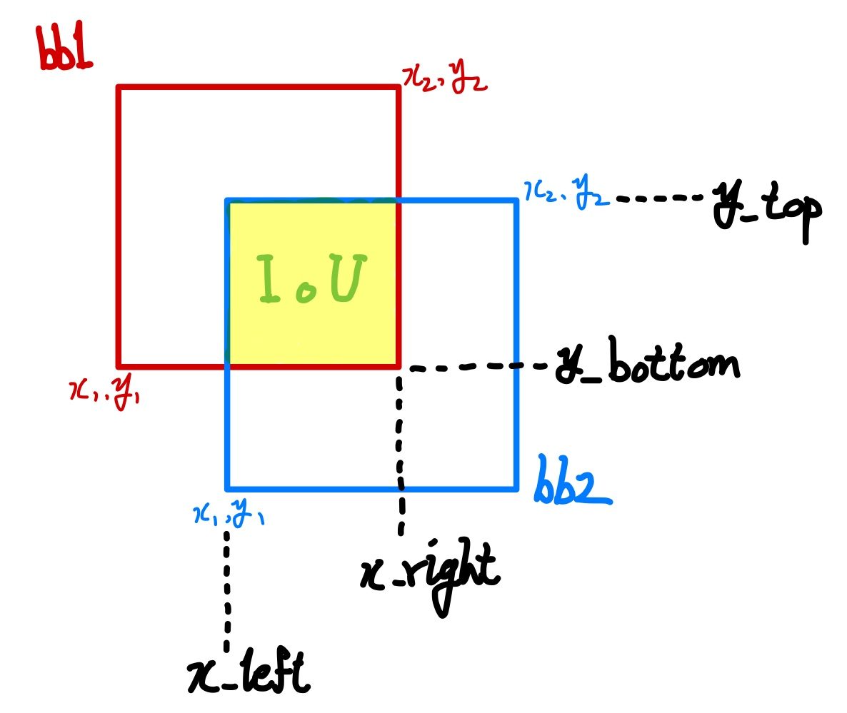 iou = (intersection_area) / (bb1_area + bb2_area - intersection_area)