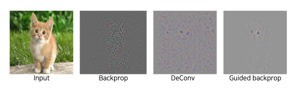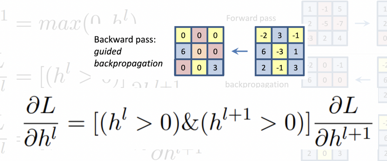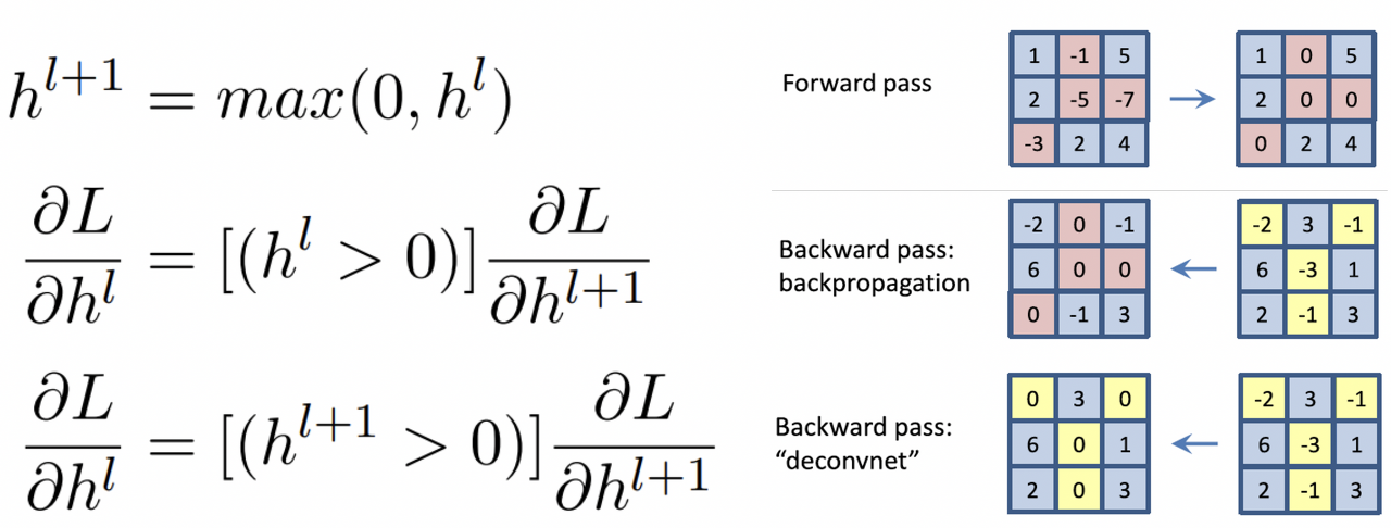 - Deconvnet 연산에서는 Backpropagation 시점을 기준으로 음수를 마스킹한다.
