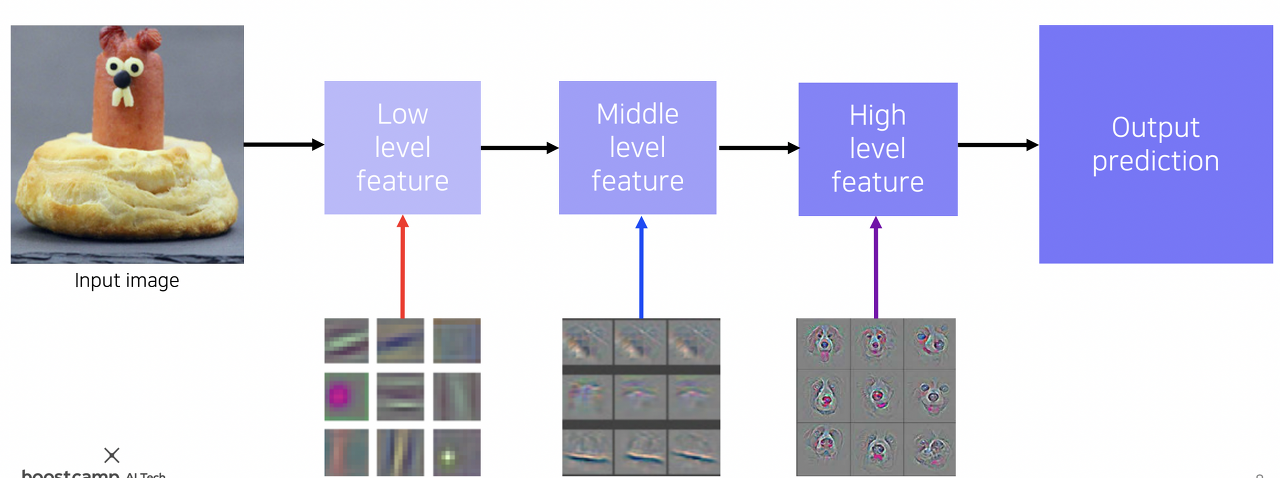- 높은 계층 -> 추상적이고 의미론적인 정보를 담고있는 필터