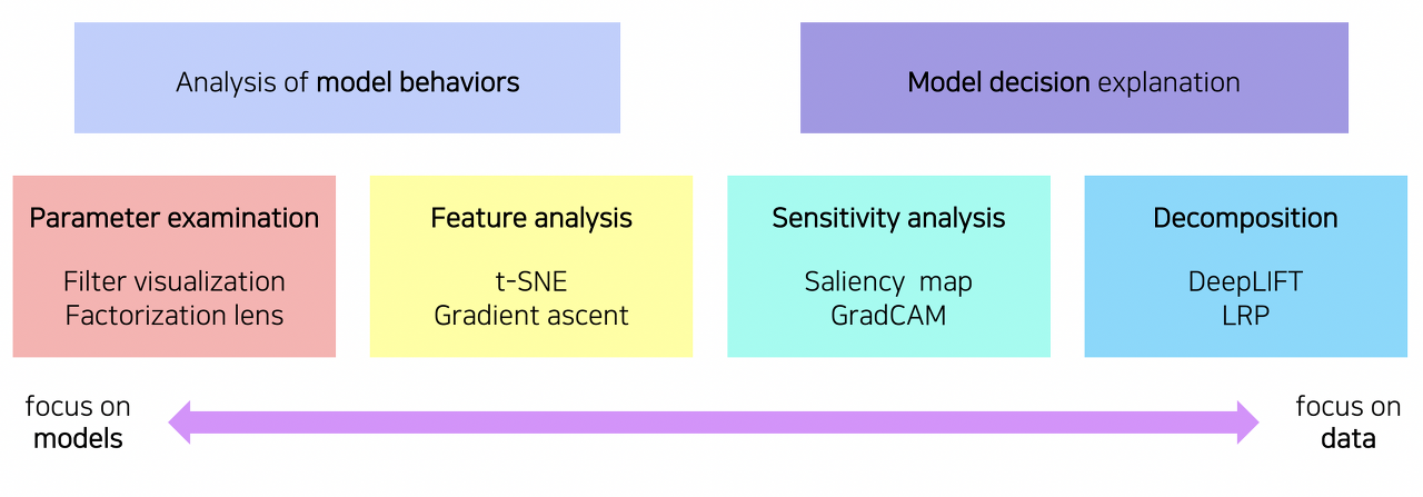 -> neural network를 시각화하는 방법은 크게 모델의 행동, 동작 방식을 분석하는 방법과 모델의 예측 결과를 설명하는 방법으로 분류할 수 있다.