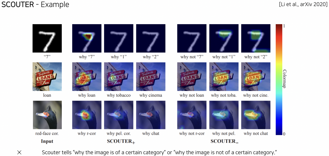 - 모델이 왜 해당 결과로 예측한 것인지에 대하여 시각화하는 방법이 Grad-CAM이라면, 모델이 왜 다른 결과로 예측하지 않았는지에 대하여 시각화하는 SCOUTER라는 방법도 제안되었다.