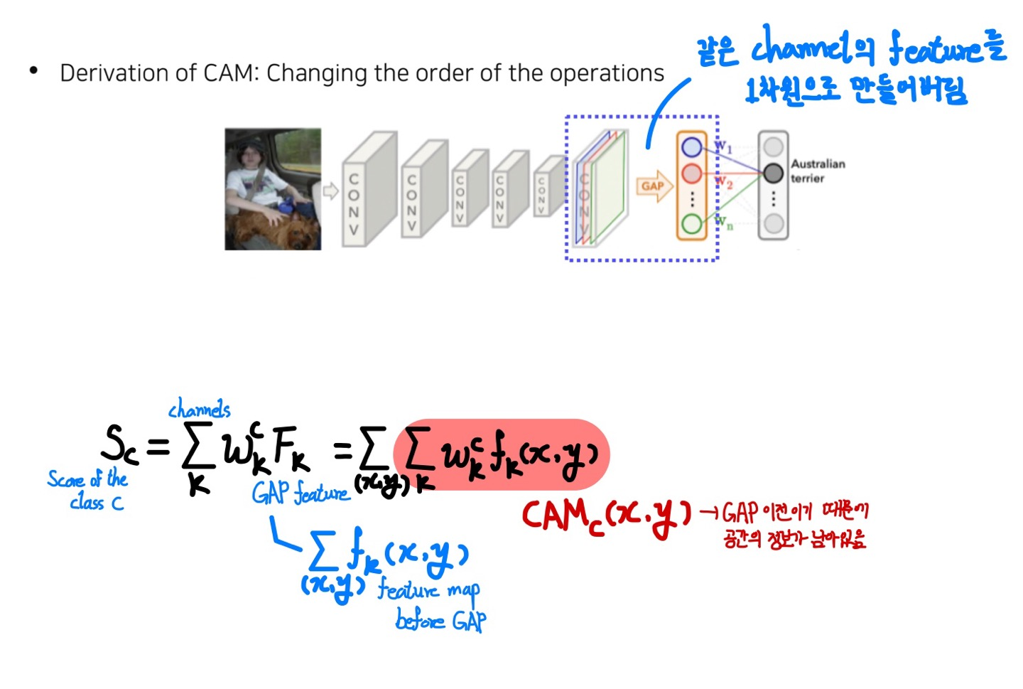 - 이렇게 구한 GAP features에 가중치를 곱하여 모두 더함으로써 class의 score를 얻을 수 있는데, 이 과정에서 수식의 변형을 통해 CAM을 구할 수 있다.
