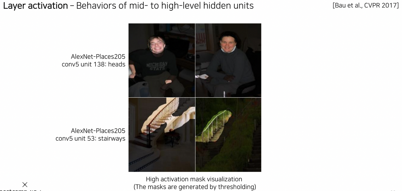 - 특정 채널의 hidden node 적절한 activation 값으로 thresholding(binary image로 표현)하여 mask를 만들고, 이를 원본 이미지에 씌우면 위 그림과 같은 결과를 얻을 수 있다.
