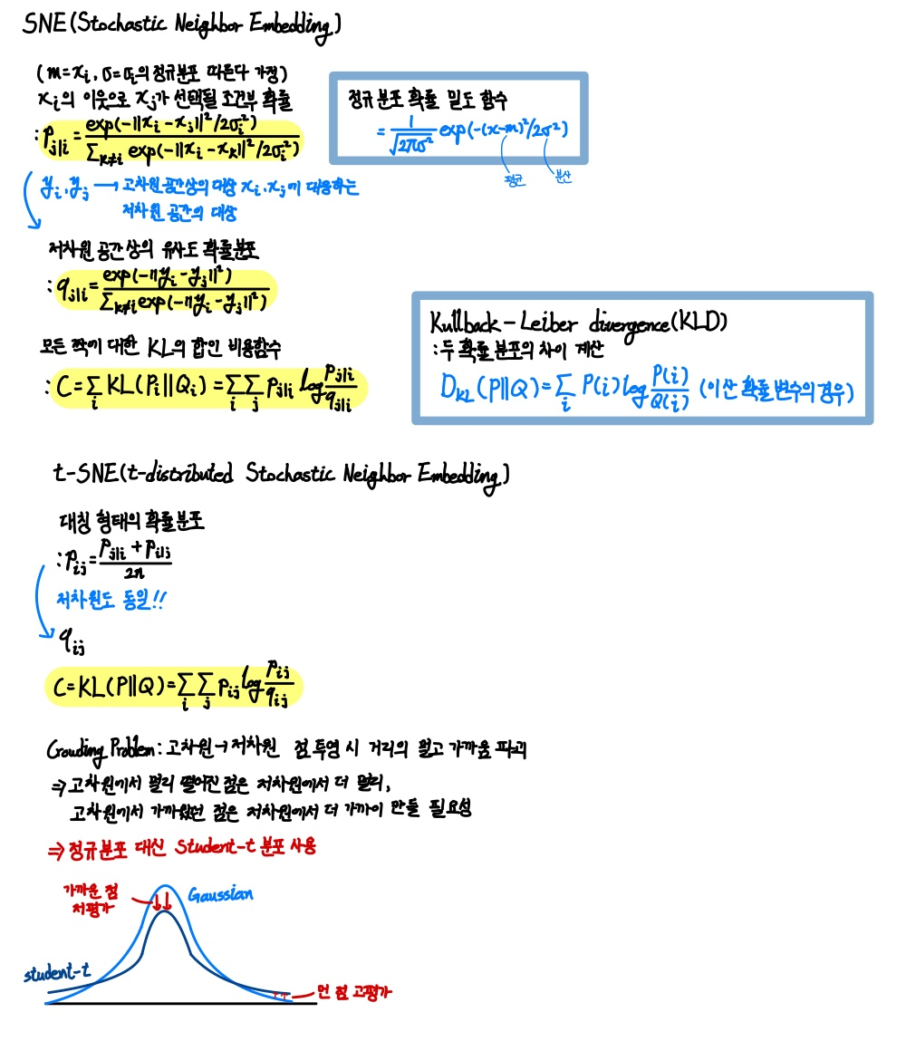 >> t-SNE는 t 분포를 사용함으로써 crowding proplem을 해결했으므로, visualization했을 때 PCA보다 clustering이 잘 보존된다!!