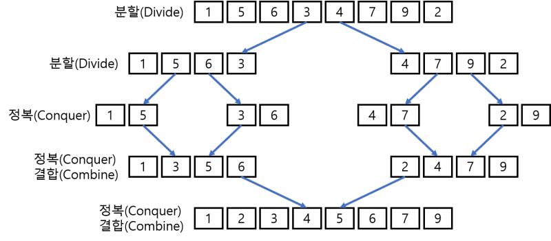 - merge: 각 문제에 대해 구한 답을 원래 문제에 대한 답으로 병합하는 과정