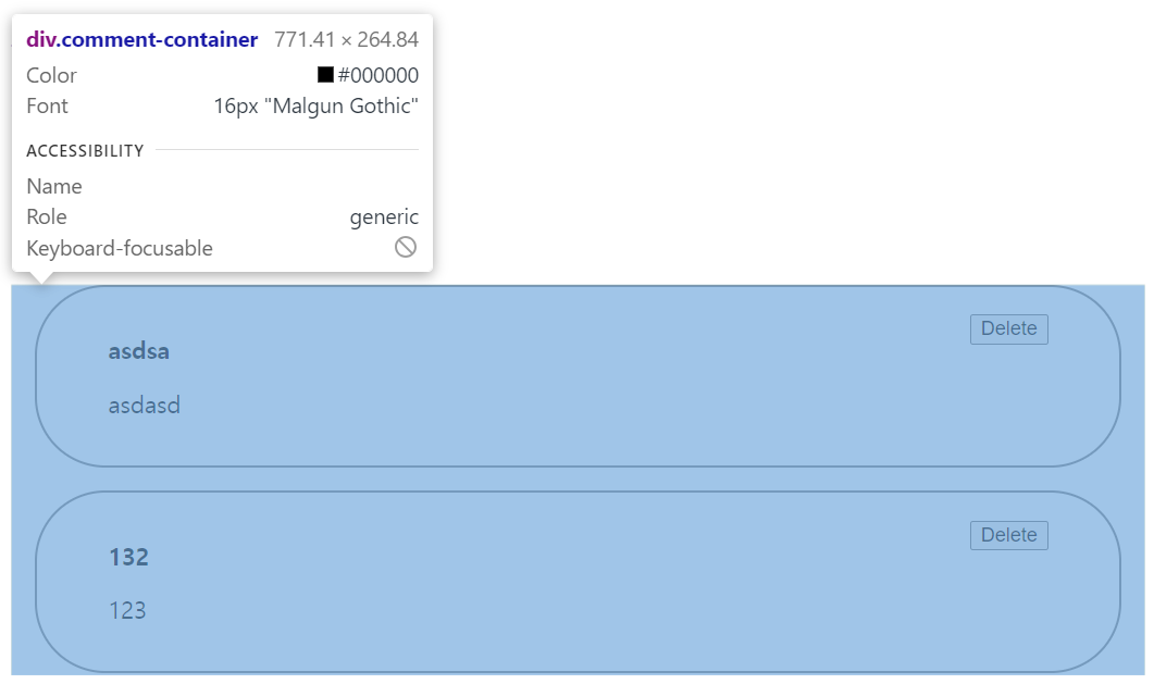 >> class: comment-div, comment-container에는 입력된 comment 정보 출력, 삭제 정보와는 각각 div, form 태그로 나눠짐