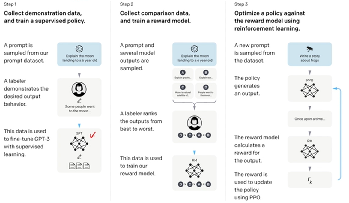 - SFT(Supervised fine-tuning) -> RM (Reward Model) training -> RL via PPO