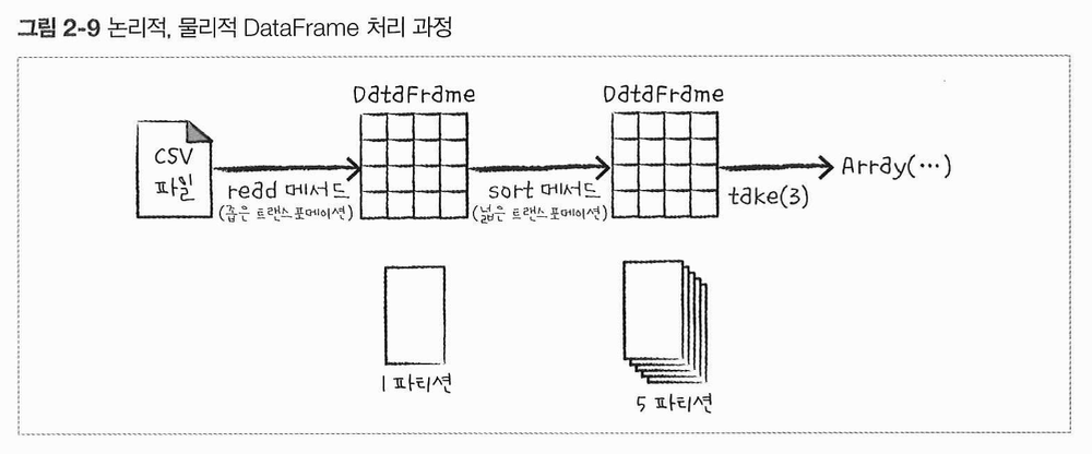 - 지연 연산(lazy evaluation): 스파크가 연산 그래프를 처리하기 직전까지 기다리는 동작 방식