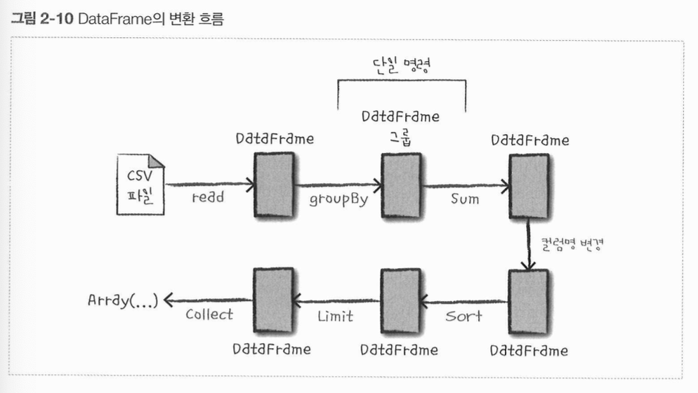 - DataFrame을 변경하려면 원하는 변경 방법을 스파크에 알려야 하는데, 이때 사용하는 명령을 트랜스포메이션이라 부른다.