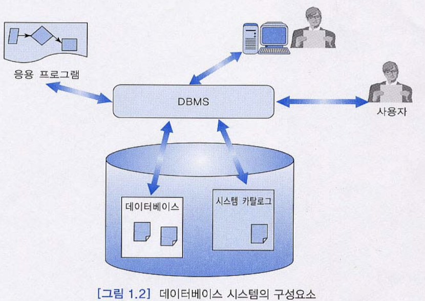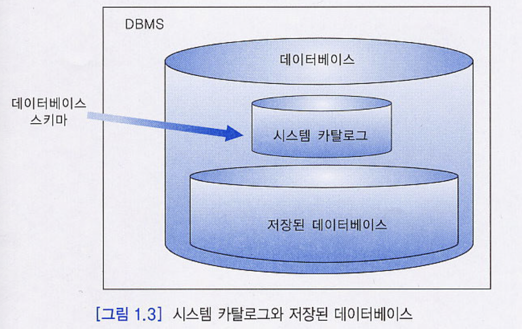 - 데이터베이스 -> 시스템 카탈로그(or 데이터 사전)와 저장된 데이터베이스로 구분할 수 있음