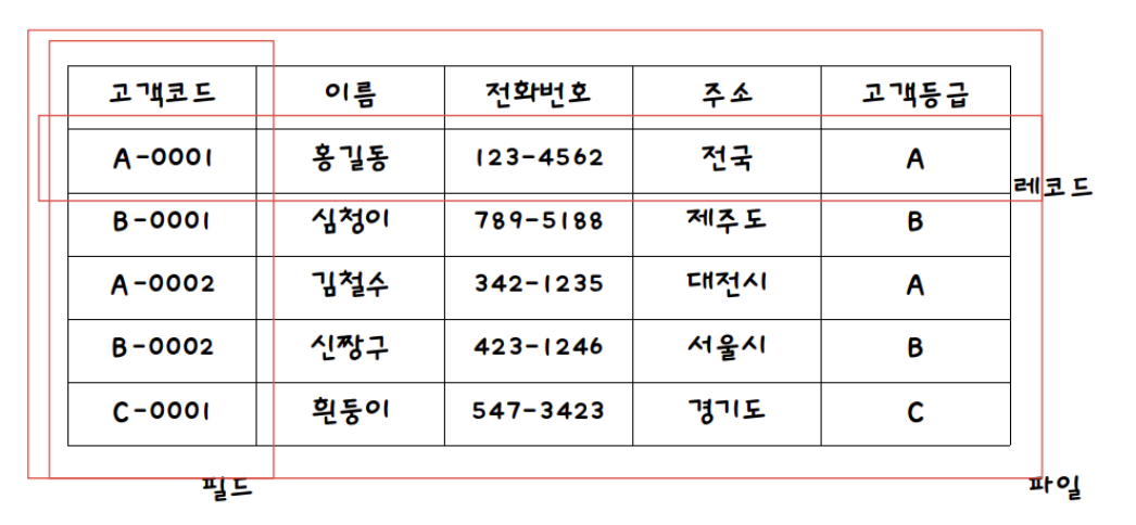 - 한 레코드 -> 연관된 필드들의 모임
