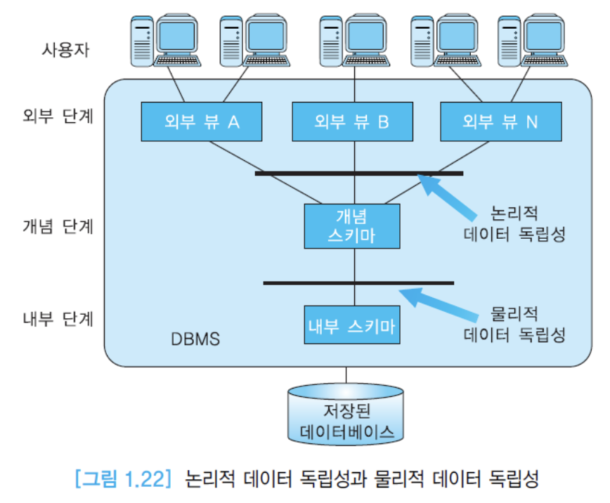 - 논리적인 데이터 독립성(logical data independence): 개념 스키마의 변화로부터 외부 스키마가 영향을 받지 않음을 의미