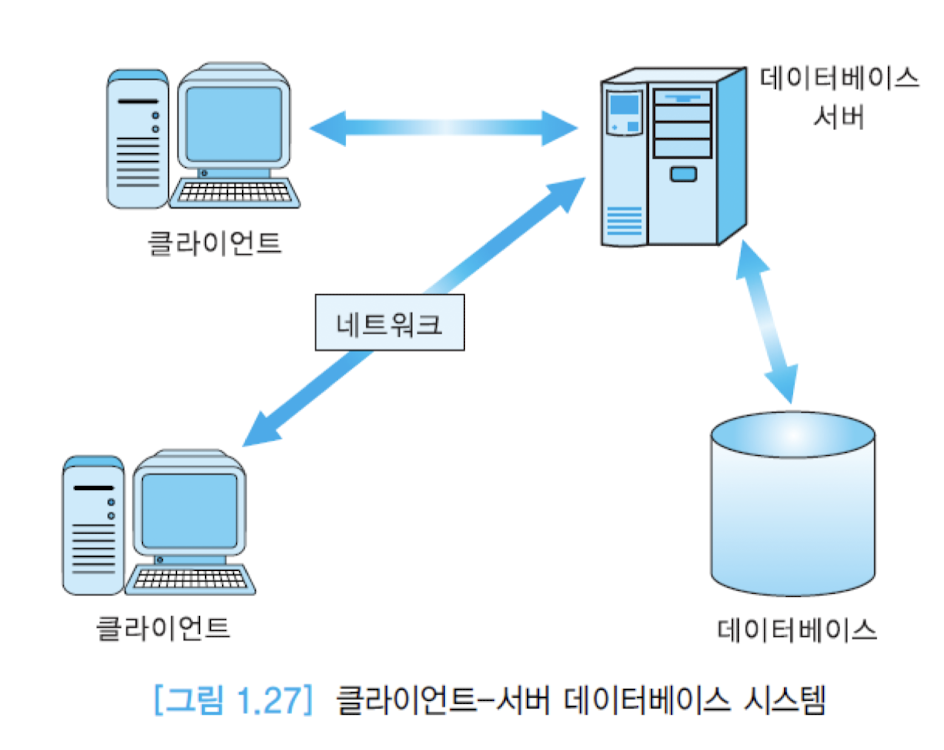 - 서버-> 데이터베이스 저장, DBMS를 운영하면서 여러 클라이언트에서 온 질의를 최적화, 권한 검사 수행, 동시성 제어와 회복 기능, 데이터베이스 무결성 유지, 데이터베이스 접근을 관리