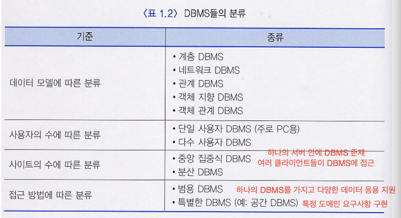 - 데이터베이스 관리 시스템(DBMS: Database Management System): 사용자가 새로운 데이터베이스를 생성하고, 데이터베이스의 구조를 명시할 수 있게 하고, 데이터를 효율적으로 질의하고 수정할 수 있도록 하며, 시스템의 고장이나 권한이 없는 사용자로부터 데이터를 안전하게 보호하면서, 동시에 여러 사용자가 데이터베이스에 접근하는 것을 제어하는 소프트웨어