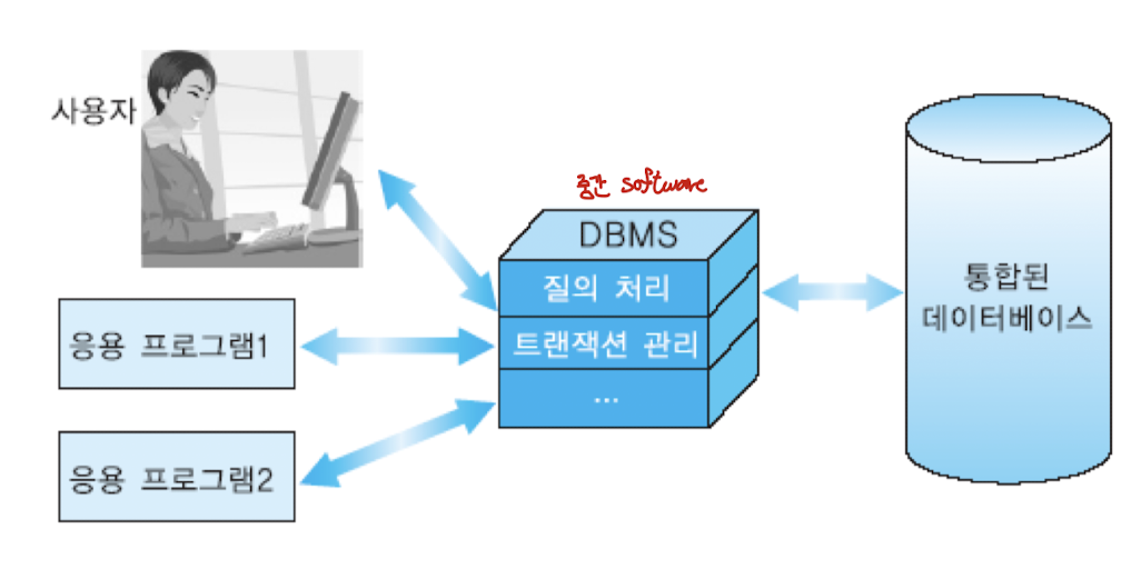 - 데이터베이스는 데이터의 대규모 저장소로서, 여러 부서에 속하는 여러 사용자에 의해 동시에 사용됨