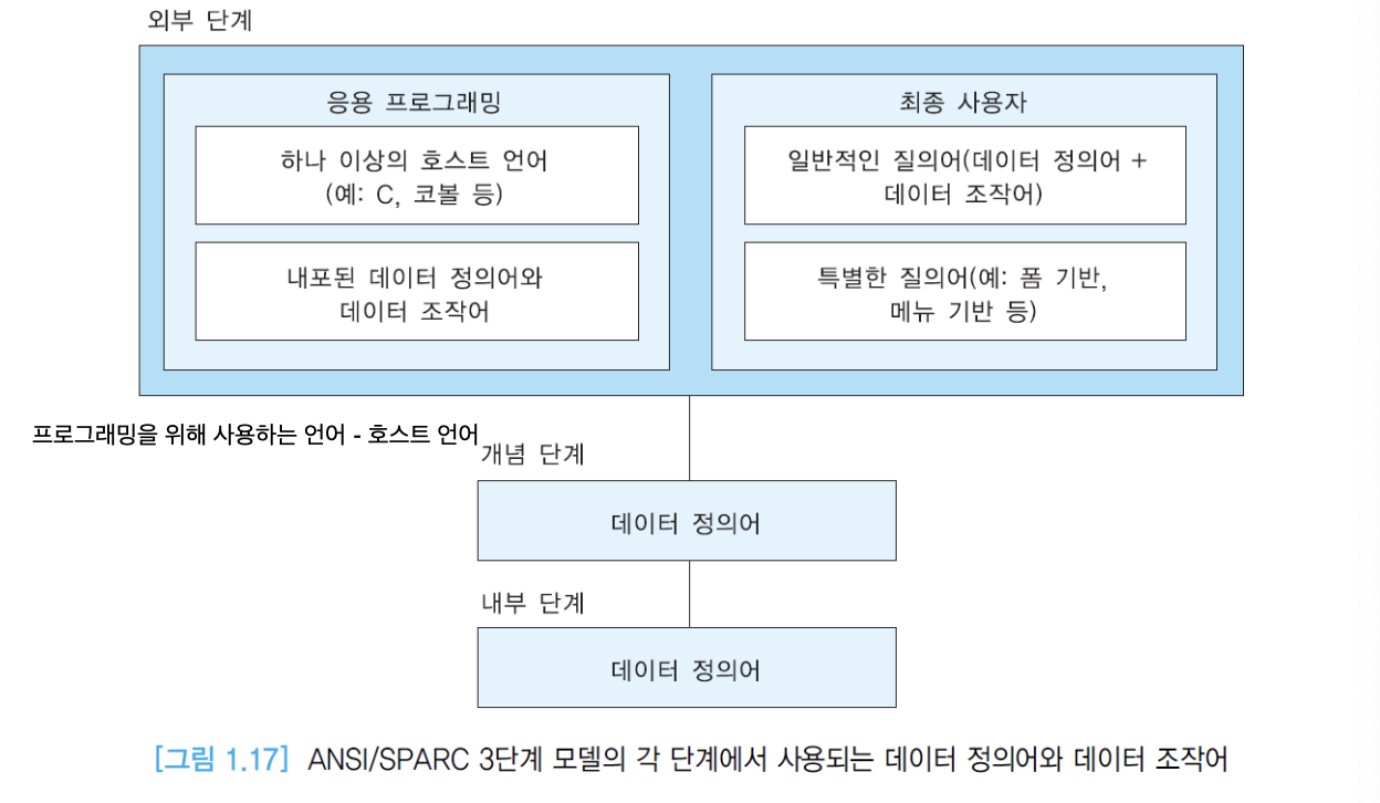 - 현재의 대부분의 상용 DBMS 구현에서 사용되는 일반적인 아키텍처는 1978년에 제안된 ANSI/SPARC 아키텍처