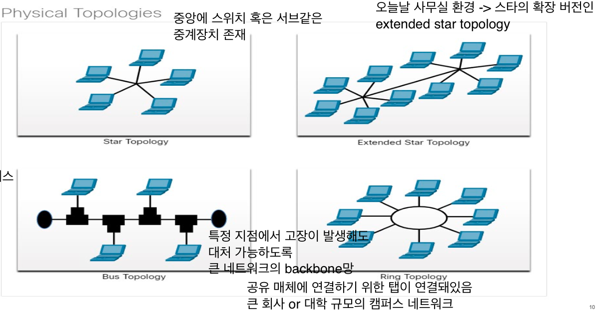 - Topology: 컴퓨터 네트워크의 요소들(링크, 노드 등)을 물리적으로 연결해 놓은 것, 또는 그 연결 방식