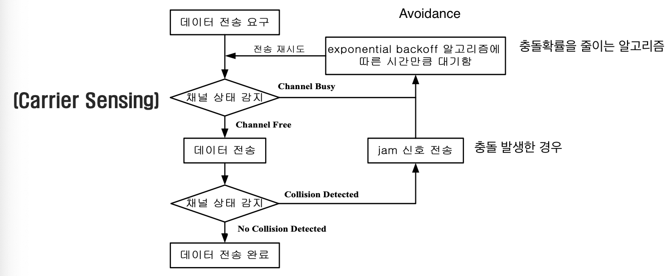 - CSMA/CD(Carrier Sense Multiple Access / Collision Detection): 충돌을 방지하면서 다중 접속하도록 하는 방식