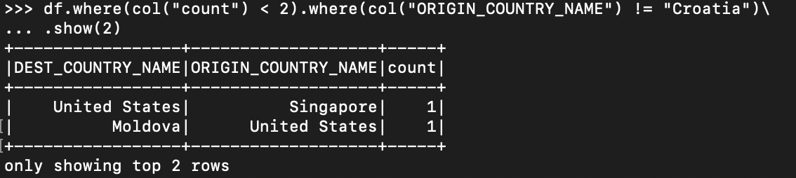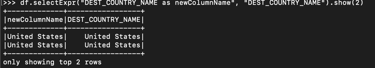 select와 selectExpr을 사용하면 데이터 테이블에 SQL을 실행하는 것처럼 DataFrame에서도 SQL을 사용할 수 있다.