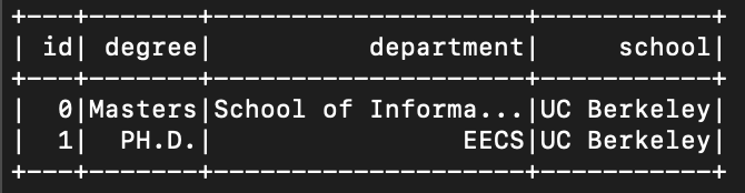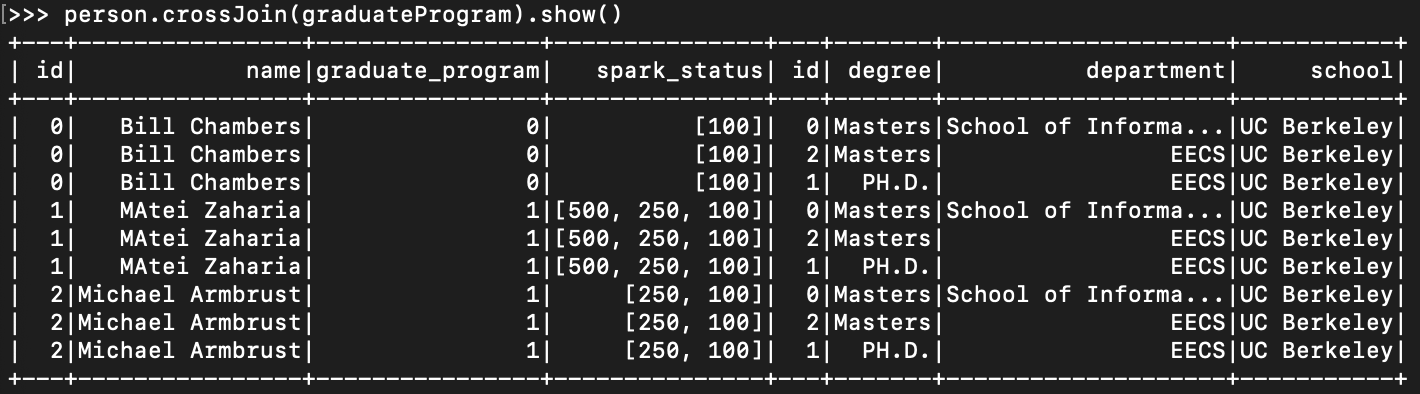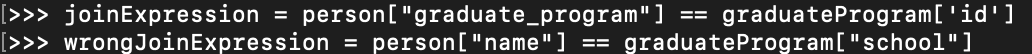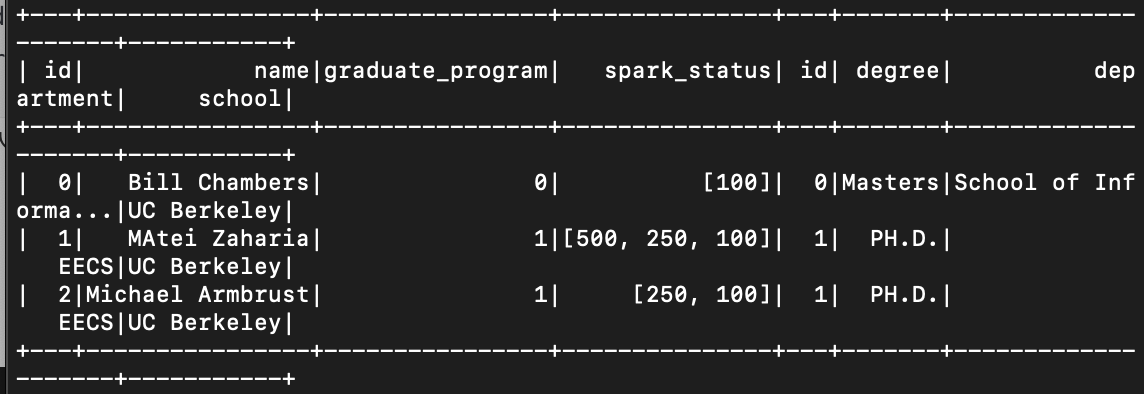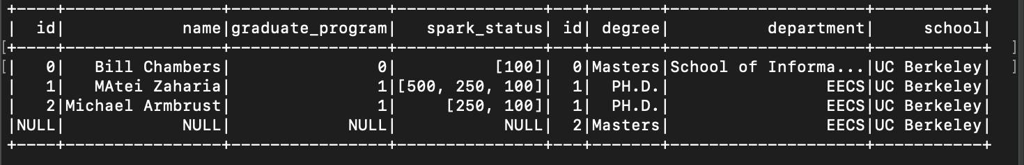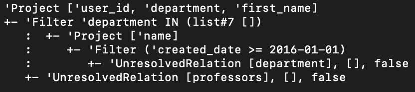 >>> spark.sql("""SELECT user_id, department, first_name FROM professors WHERE department IN (SELECT name FROM department WHERE created_date >= '2016-01-01')""")