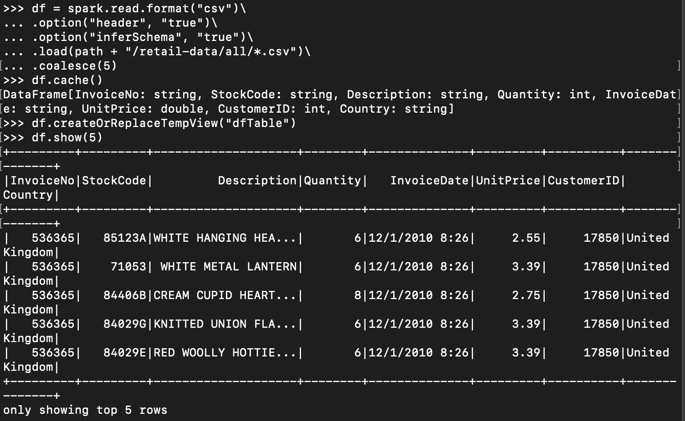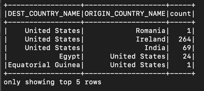 ... .load("/Users/sangyeong-park/CE/KHUDA_5th/Data_Engineering/Spark-The-Definitive-Guide-master/data/flight-data/orc/2010-summary.orc").show(5)