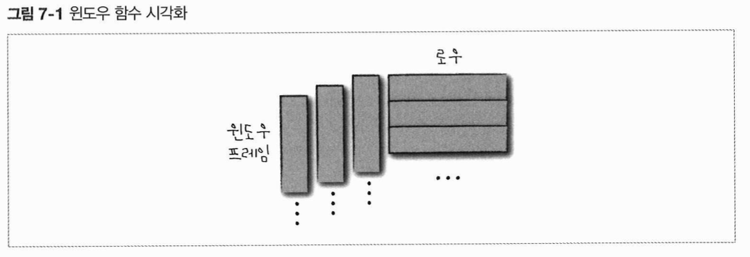 - 윈도우 함수는 frame에 입력되는 모든 로우에 대해 결괏값을 계산, frame은 로우 그룹 기반의 테이블을 의미