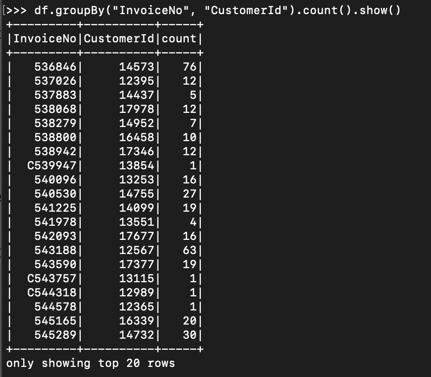 - 첫 단계에서는 RelationalGroupedDataset이 반환되고, 두 번째 단계에서는 DataFrame이 반환된다.