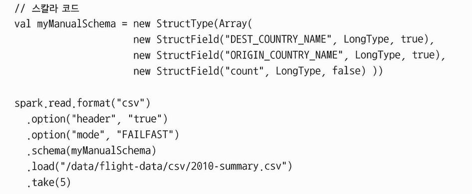 -> 스파크가 데이터를 읽어들이는 시점에 문제가 발생 -> 스파크는 지연 연산 특성이 있으므로 DataFrame 정의 시점이 아닌 잡 실행 시점에만 오류가 발생한다.