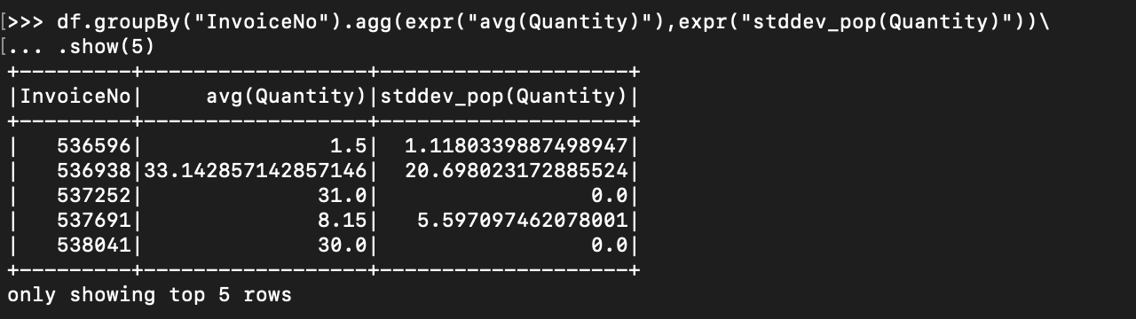 - 컬럼을 키로, 수행할 집계 함수의 문자열을 값으로 하는 map 타입을 사용해 트랜스포메이션을 정의