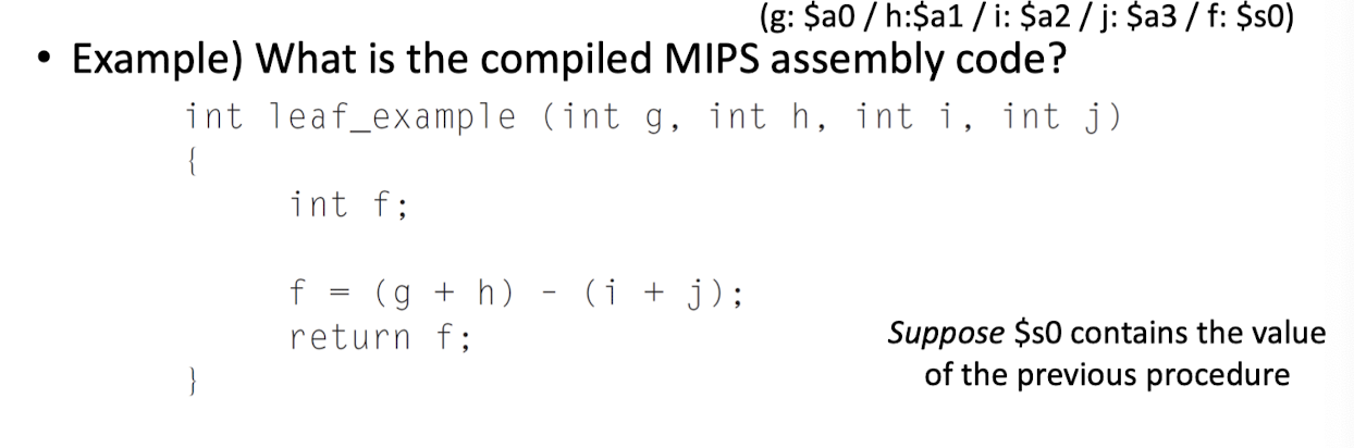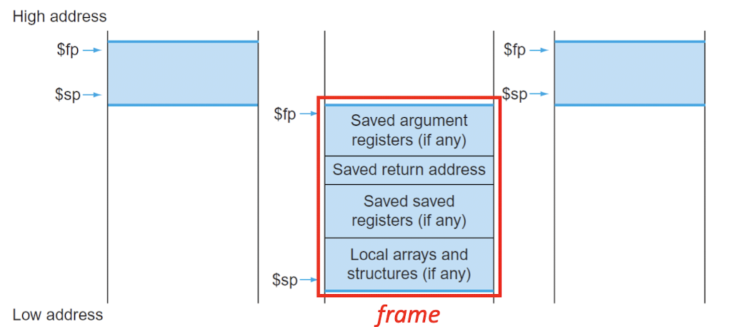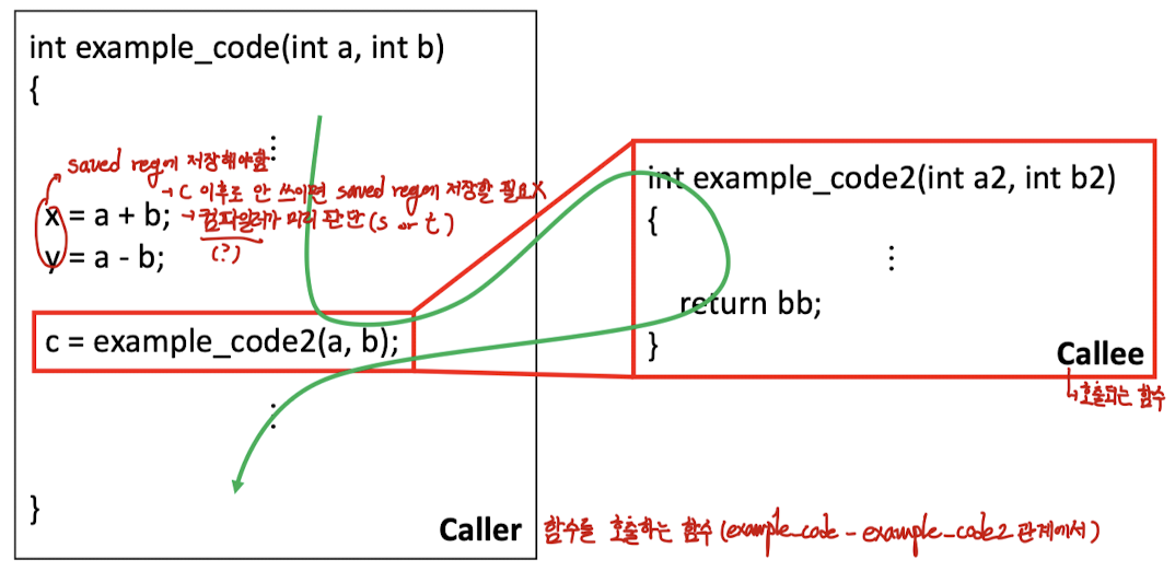 - 컴파일러는 상황에 따라, 4개의 argument regs($a)와 2개의 return value regs($v)보다 더 많은 레지스터를 필요로 할 때가 있다.