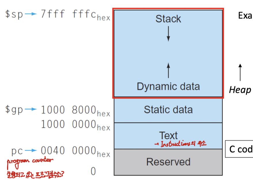 - Stack pointer($sp) register: 스택에서 가장 가장 최근에 할당된 주소를 가리킴