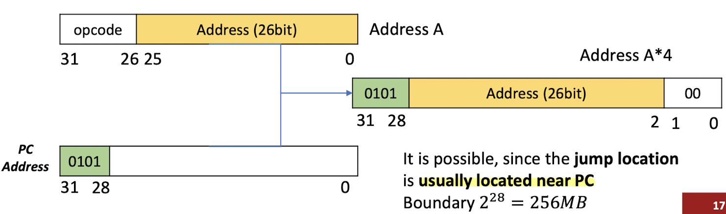 - Jump address가 PC의 upper bits와 명령어의 26bits가 합쳐진 형태