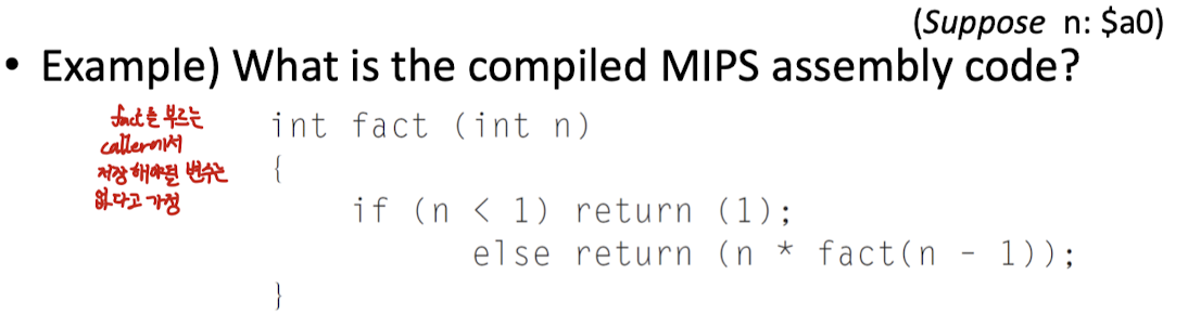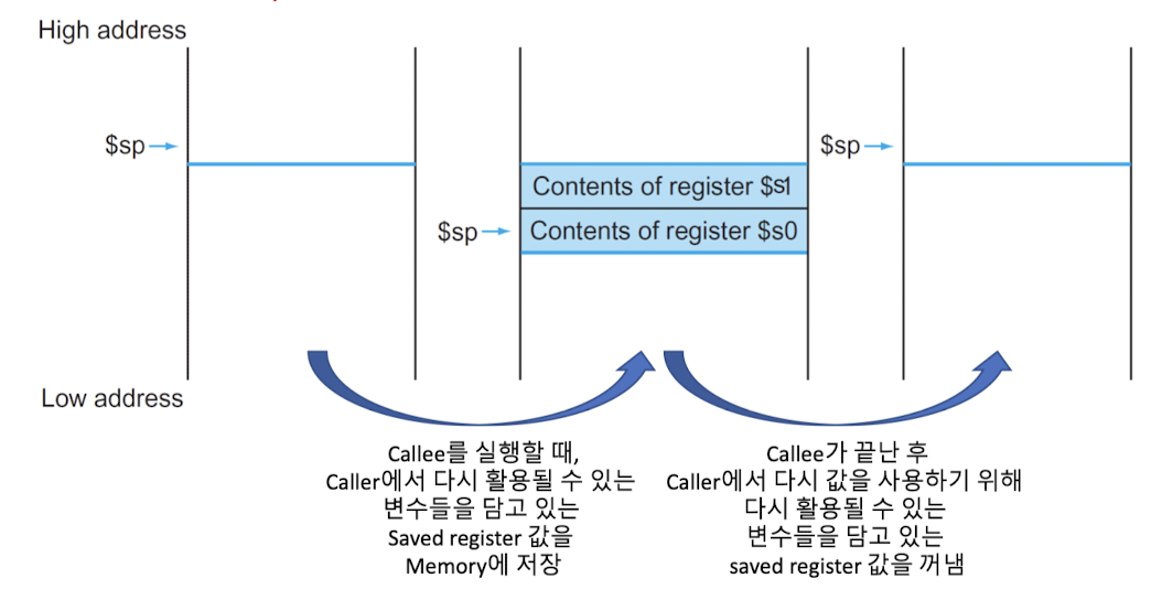 - callee procedure를 수행할 때, register에 저장된 값이 사라질 수 있음 -> callee procedure를 마치고 caller procedure로 복귀할 때 다시 활용하게 될 수 있는 변수 값을 memory에 미리 저장