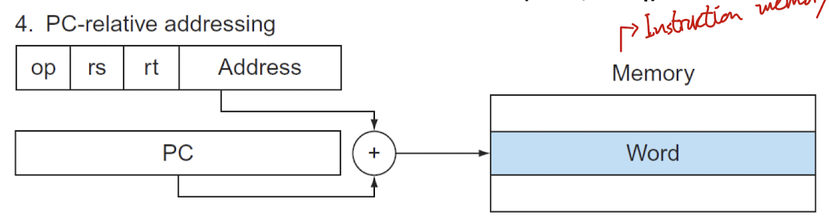 - Branch Addressing(Beq, Bne) -> PC-relative Addressing