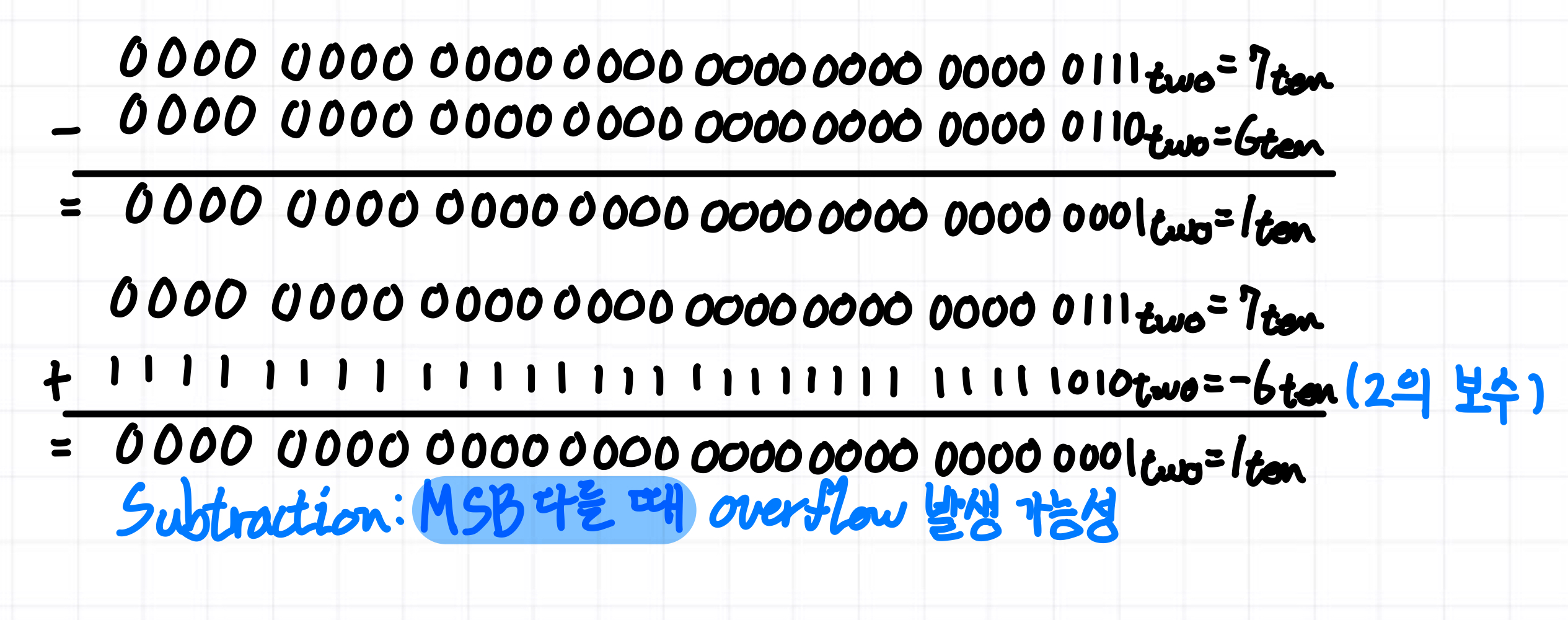 - Signed instructions: add, addi, subtract는 overflow exception 발생시킬 수 있음