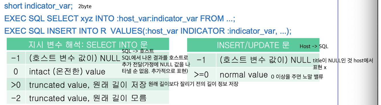 - 호스트 변수 바로 다음에 지시 변수를 선택적으로 추가 -> 지시 변수도 앞에 콜론(:) 붙임, 호스트 변수와 지시 변수 사이에 선택적으로 INDICATOR 키워드 사용 가능