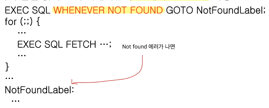 - 루프 종료 조건: 결과 집합이 비었거나 더 이상의 가져올 투플이 없으면 FETCH문은 'no data found'에러를 발생시키고, WHENEVER NOT FOUND가 이를 인지함